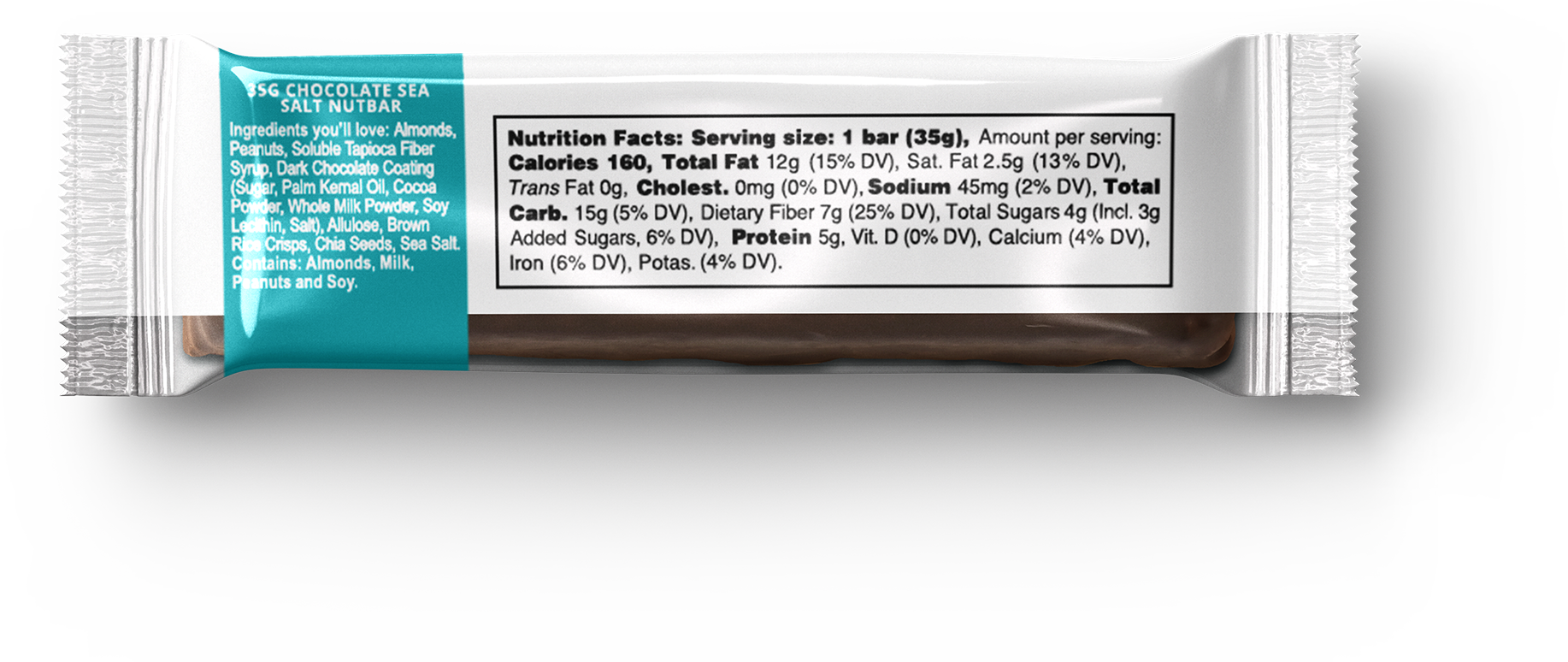 Calories 160 Serving Size 35g %DV Serving Size %DV Total Fat 12g 15% Total Carbohydrate 15g 5% Saturated Fat 2.5g 13% Dietary Fiber 7g 25% Trans Fat 0g Total Sugar 4g Cholestrol 0mg 0% Includes 3g Added Sugars 6% Sodium 45mg 2% Protein 5g Vitamin D - 0% Calcium - 4% Iron - 6% Potassium - 4%